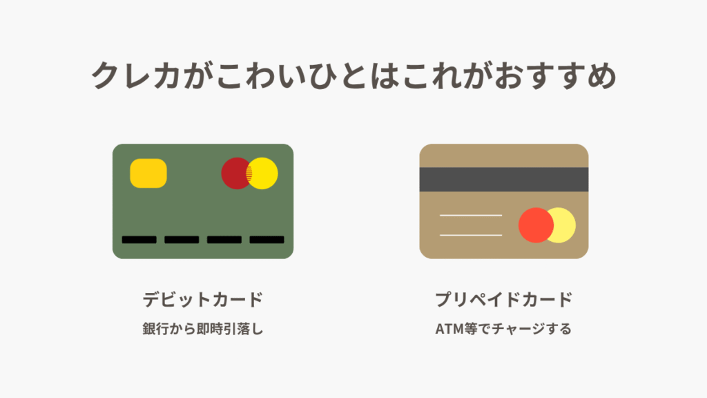 クレジットカード決済には「デビットカード」や「プリペイドカード」も似た仕組みで使うことができます。支払い方法が少し異なります。