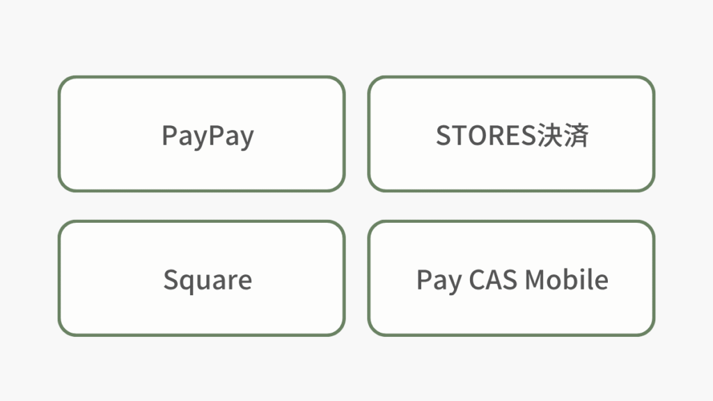 具体的なブランドだと、QRコード決済単体は「PayPay」。複合型端末は「STORESレジ」「Square」「Pay CAS Mobile」あたりが店舗なしでも導入しやすいものになります。