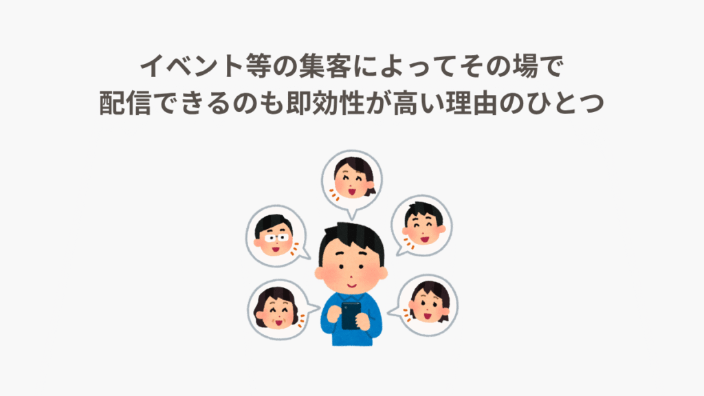 例えばイベント出店をするとしましょう。当日思ったより集客がないなと思ったら、ちょっとした宣伝をその場で、スマホで配信できるのです。