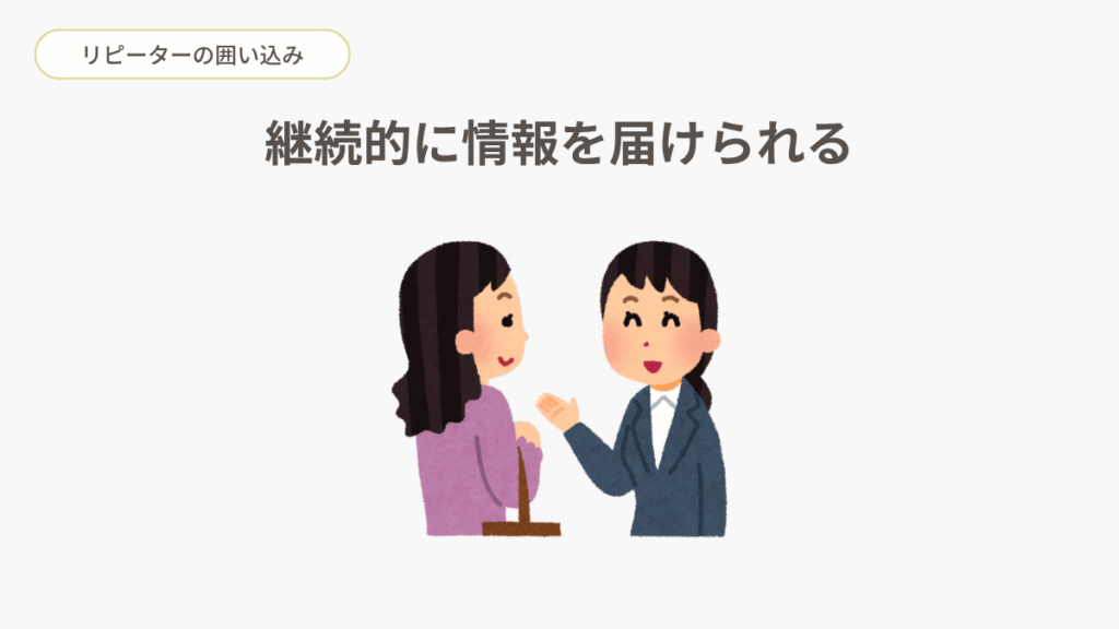 一度「友だち登録」してもらうと継続的に情報を届けられるようになります。もちろんお客さんがブロックしてしまったらストップしますが、ブロックしない限りは届きます。