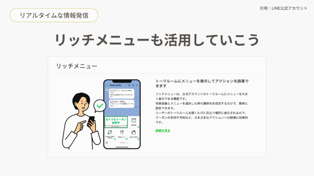 「友だち」と呼ぶユーザーに対してさまざまなアプローチでアピールができます。