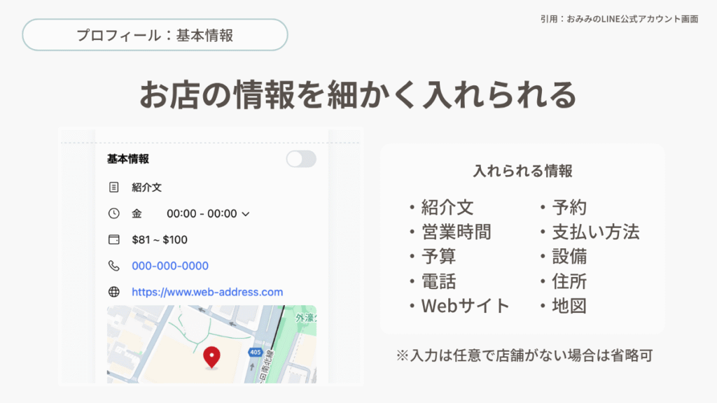 お店の情報を割と細かいところまで入れることができます。入力は任意ですので、店舗がない場合は省略も可能。