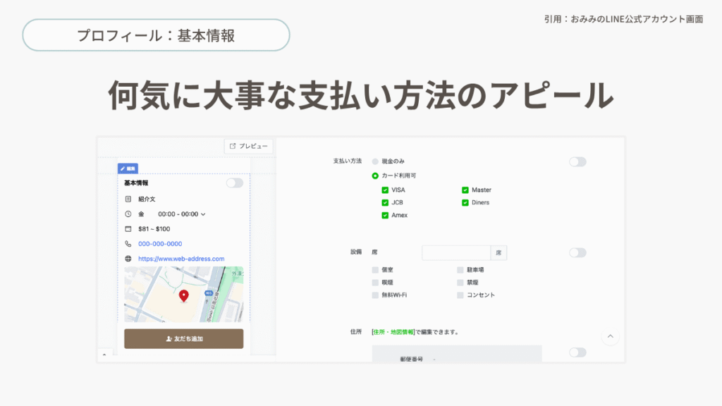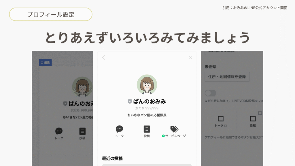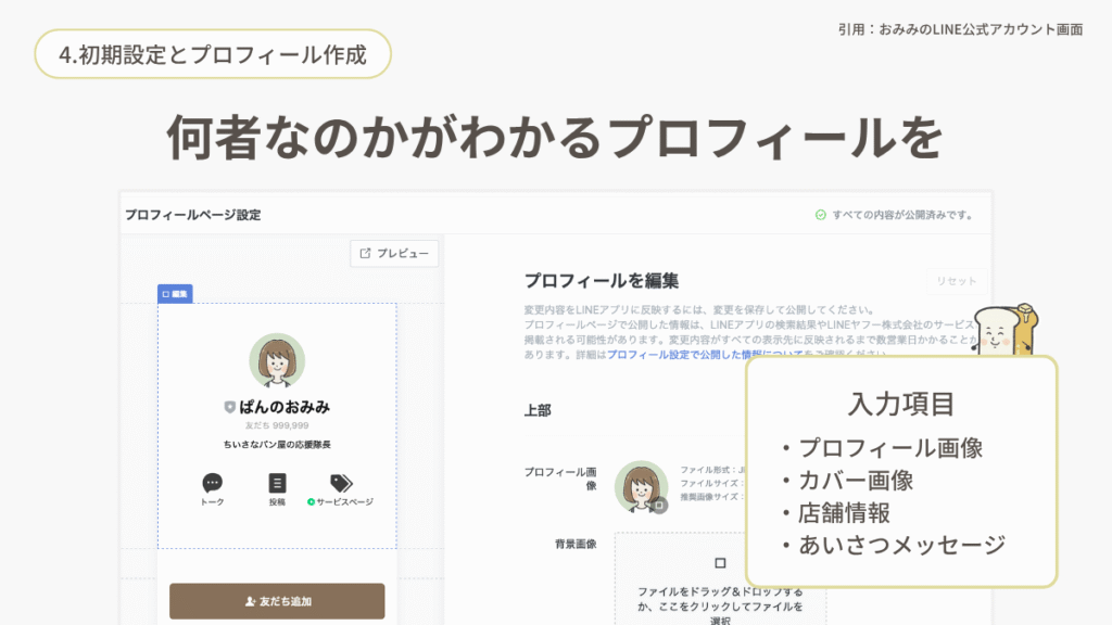 プロフィール画像・カバー画像・店舗情報・あいさつメッセージなどを登録していきましょう。
