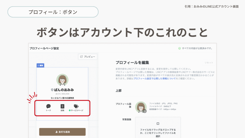 アカウント名、ステータスメッセージ、プロフィール画像、背景画像 の設定ができます。