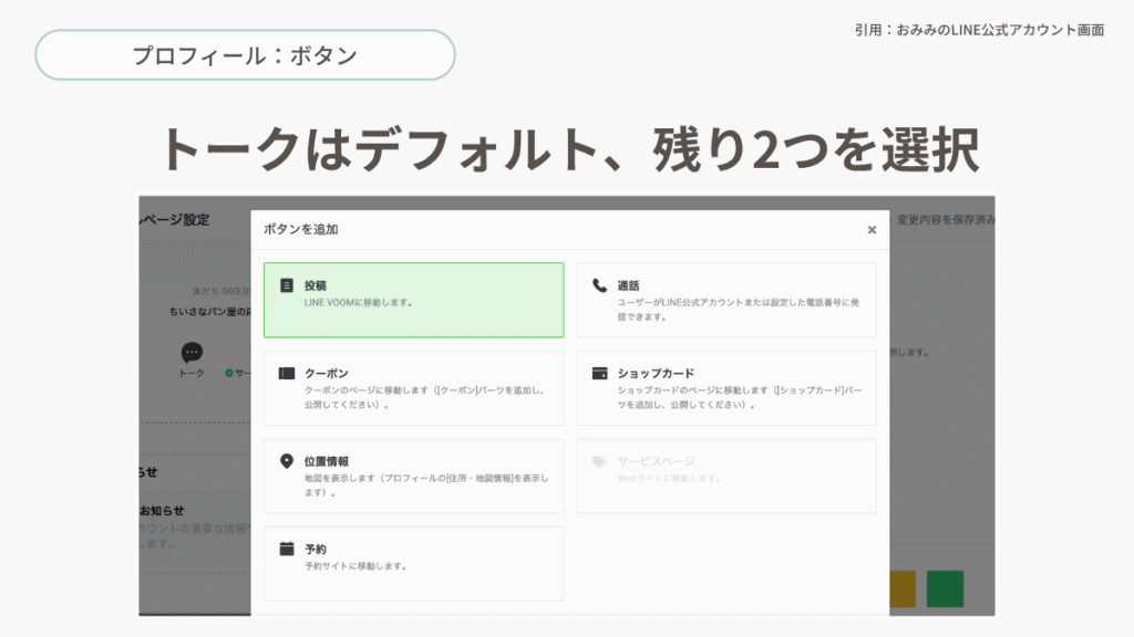 「トーク」はデフォルトで表示されますので、1枠は確定。残り2つのボタンは6種類から選ぶことができます。
