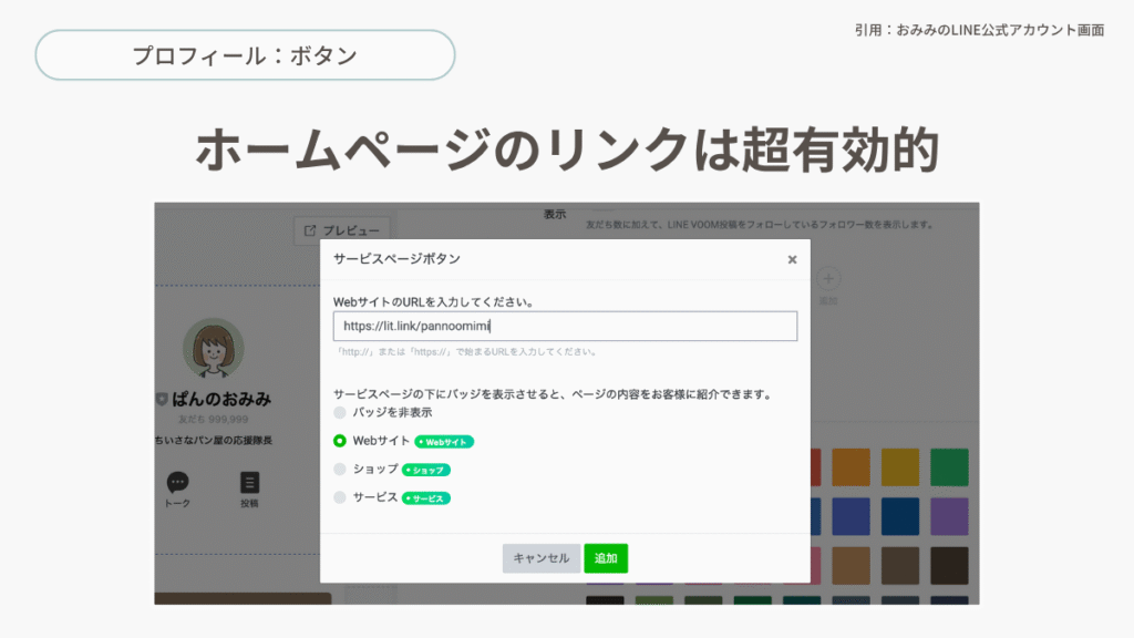 例えばサービスページを選択するとリンクを入れられます。表示も「Webサイト」「ショップ」「サービス」から選べます。