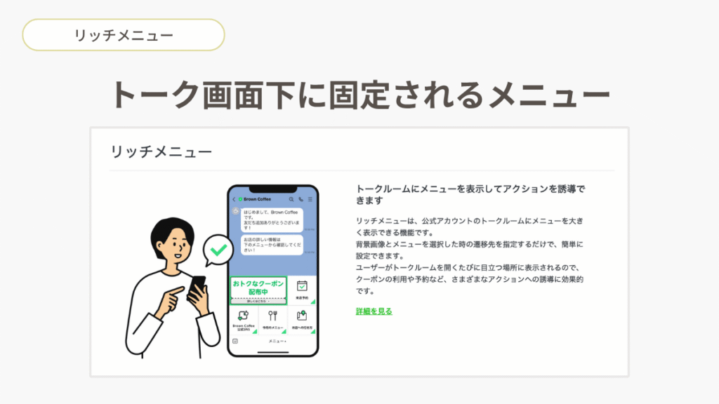 リッチメニューはリンクが固定できるため、情報にすぐアクセスできるのが魅力です。