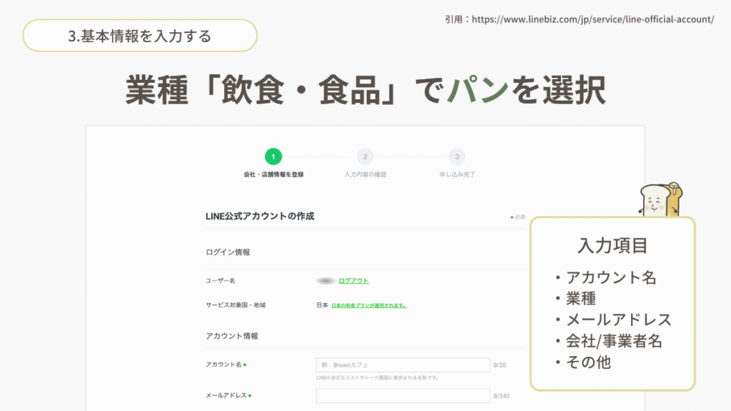 業種に関しては「飲食・食品」を選ぶと「パン・ベーカリー」など細かいものが出てくるので、該当するものを選択します。情報を入力後に「完了」ボタンを押して、アカウントの開設は完了です。
