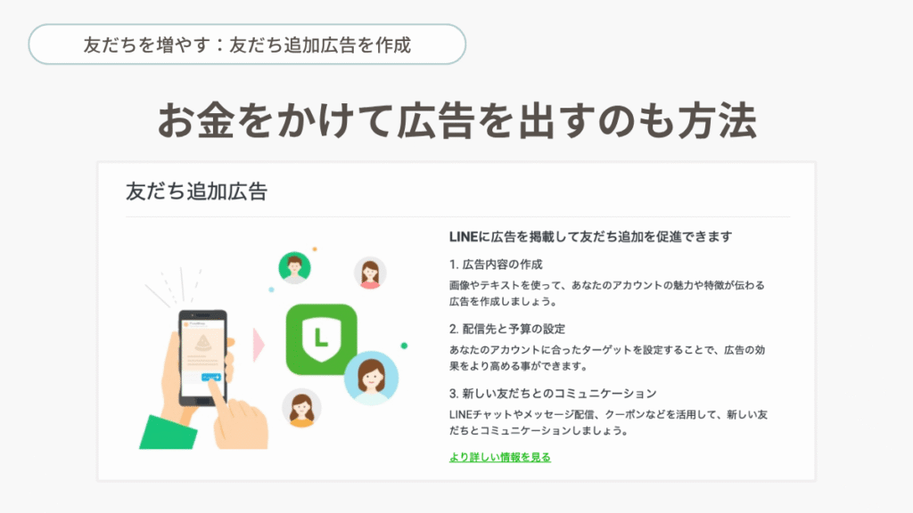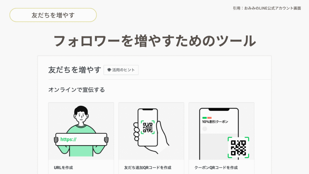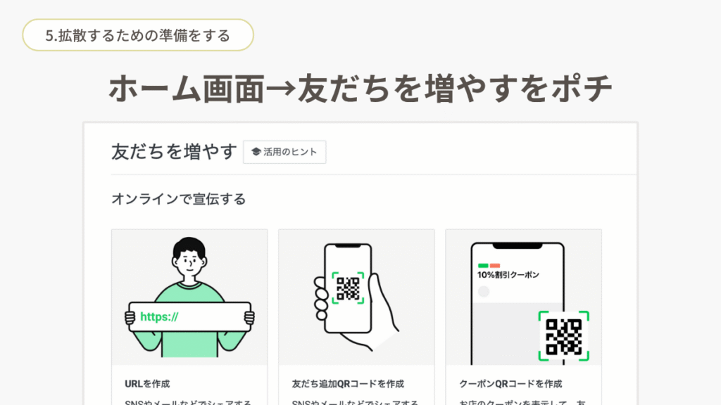ホーム画面に「友だちを増やす」というボタンがありますので、そちらをクリックしてみましょう。