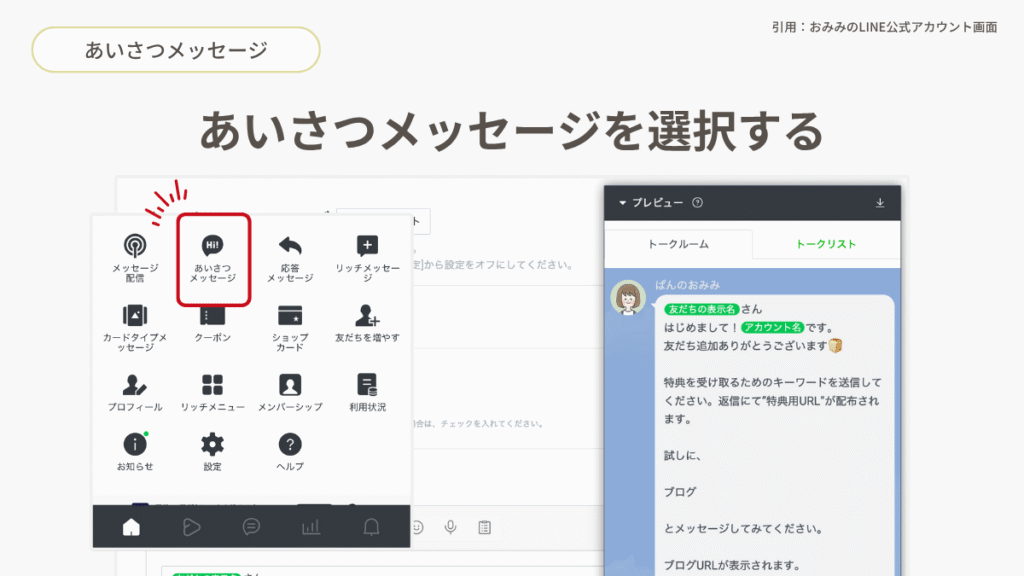 設定はとても簡単。管理画面にある「あいさつメッセージ」から設定していきます。プレビューでどのように配信されるかもみられますので、確認しながら進めていきましょう。