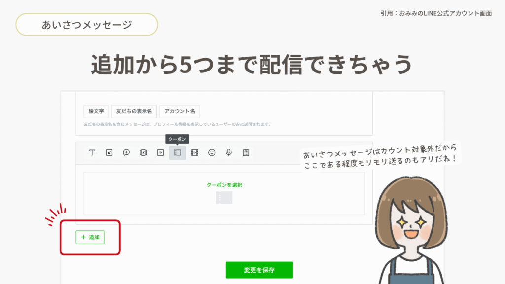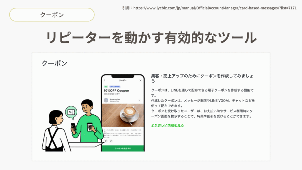 下の「追加」というところから、クーポンやカードメッセージなどを選択できます。ここにクーポンを入れる場合は別の場所でクーポンをつくる必要があります。