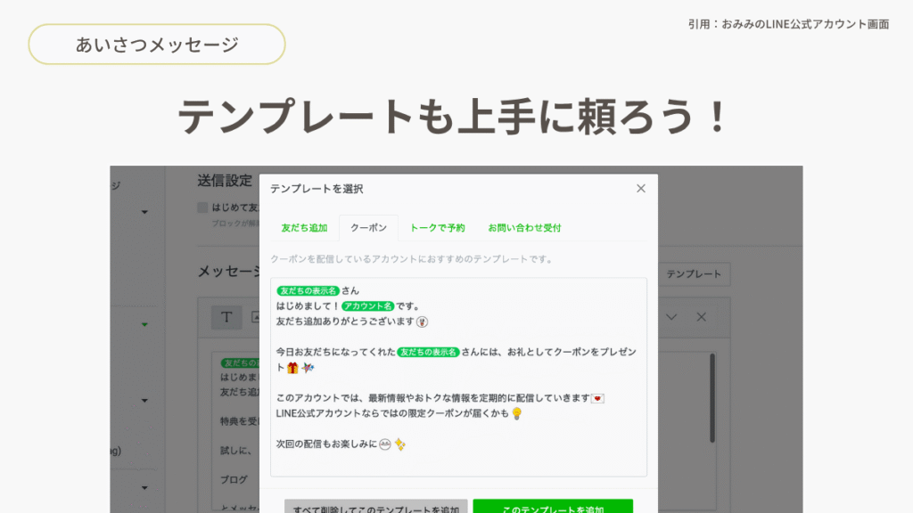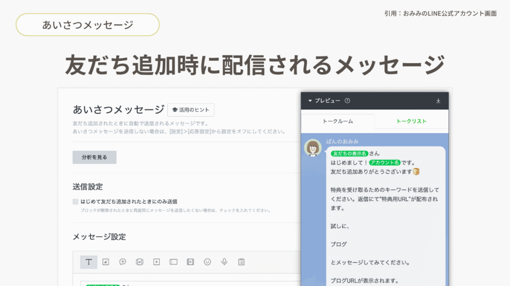 あいさつメッセージとは「友だち追加と同時に自動で配信されるメッセージ」のこと。