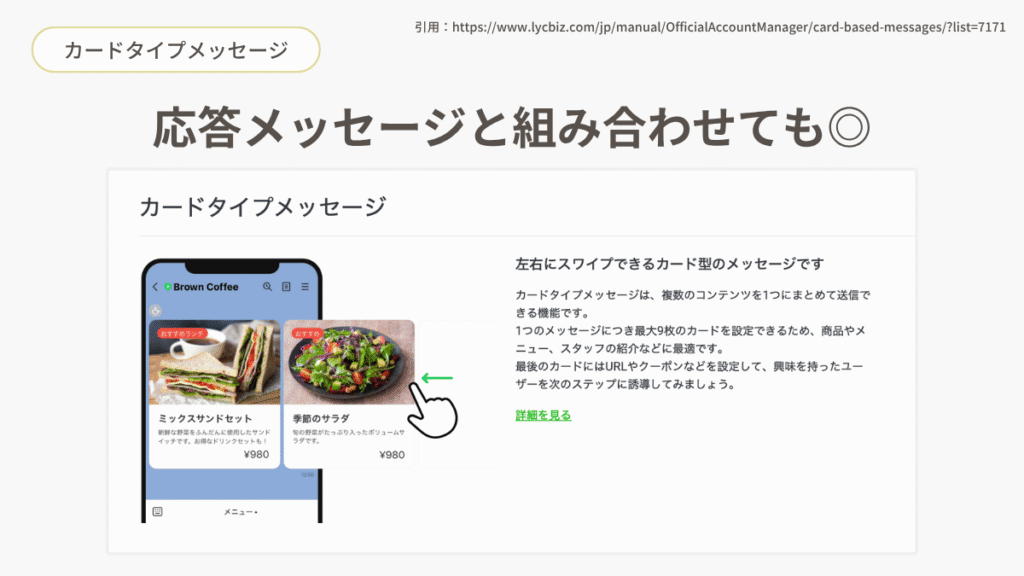 なるべく1クリックで進めるとお客さんも次の情報を得ようと思えます。単にリンクを設定するだけでなく、応答メッセージ機能を組み合わせることでもう一歩次の使い方もできます。