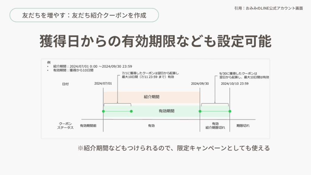 クーポン獲得日からの有効期間や獲得枚数も設定可能です。紹介期間というのもありまして、限定的にキャンペーンとして利用もできます。