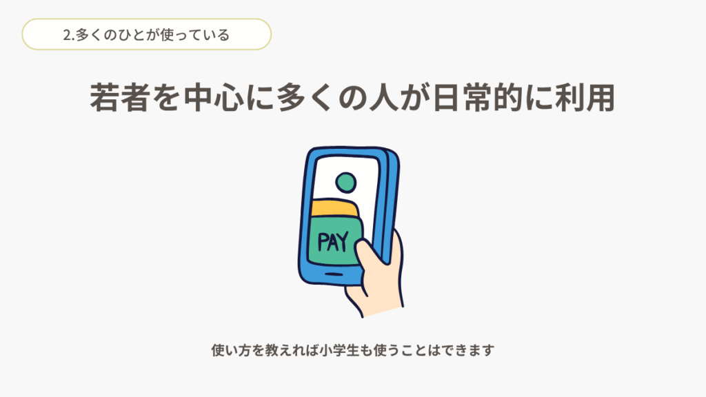 若者を中心に多くのひとが日常的に利用しています。というのもQRコード決済には年齢制限はありません。