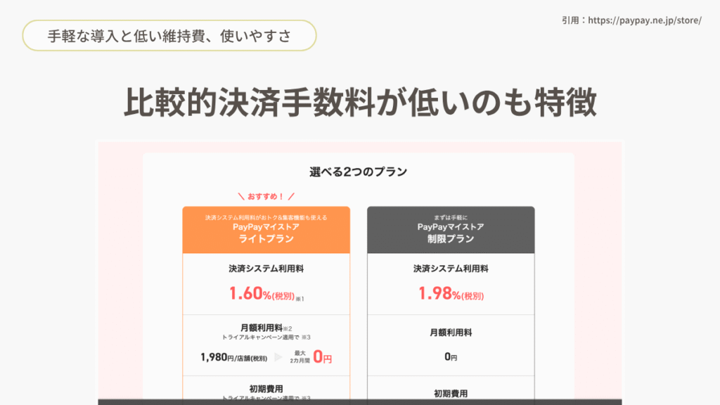もちろんPayPayにも決済手数料はあるのですが、クレジットカードの決済手数料が3.25%程度なのに対しPayPayは1.98%と1%以上離れているのもポイント。