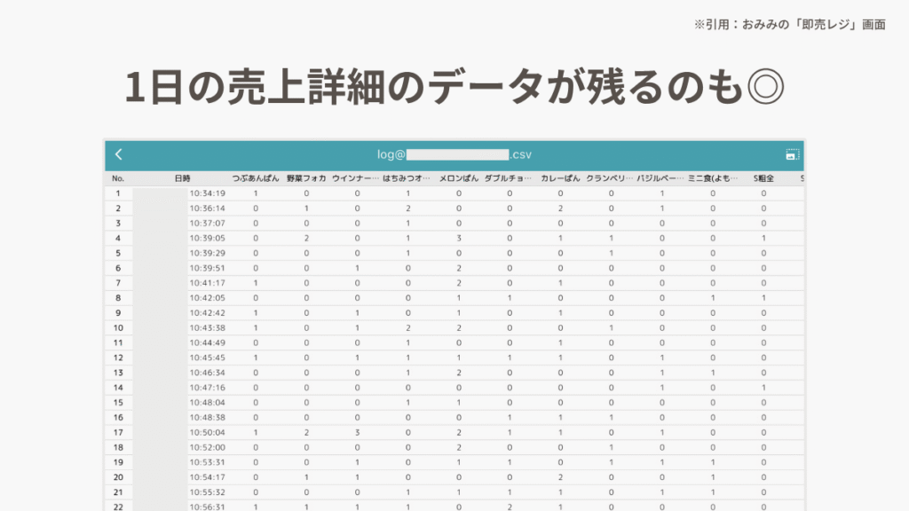 ありがたいのが1日の売上詳細のデータが残ること。しかも一覧で表示することができます。もちろんデータは保存可能。やりようによっては現金などの支払方法もここで管理できます。
