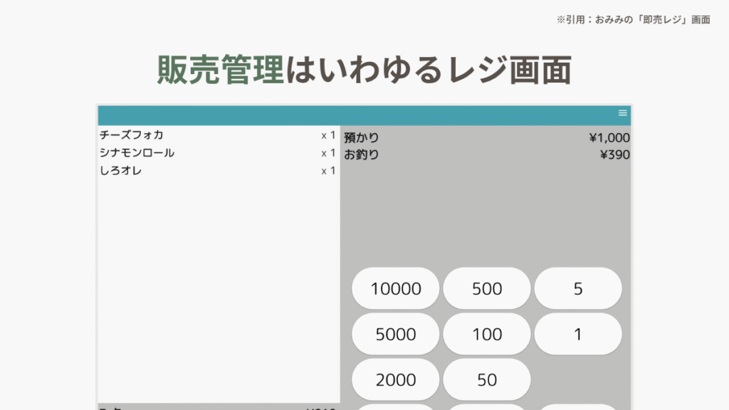 「販売管理」はいわゆるレジ画面。現金決済を想定しての管理画面ですが、上手にアイテムを管理すれば支払方法の区分けもできるようになります。