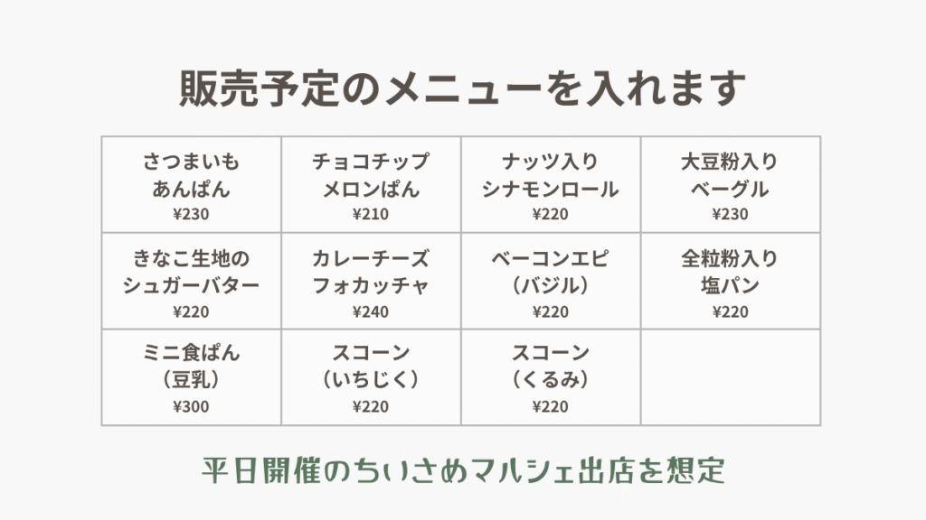 で、その日の反省に「このパンが異様に早く売れた」とか、「今回は売れ残っちゃったな」とかも残しておくと今後の販売にも活かせます。
