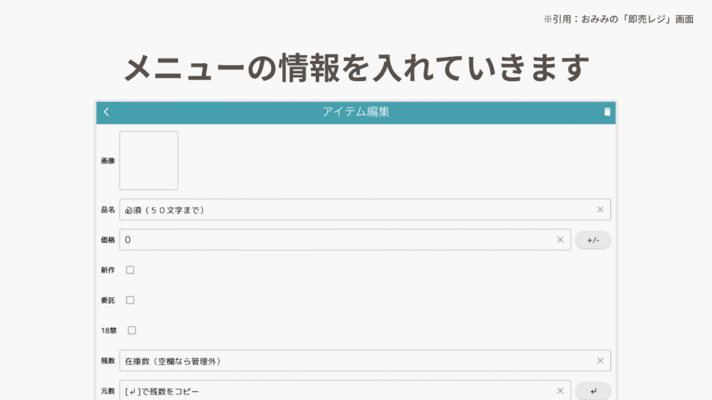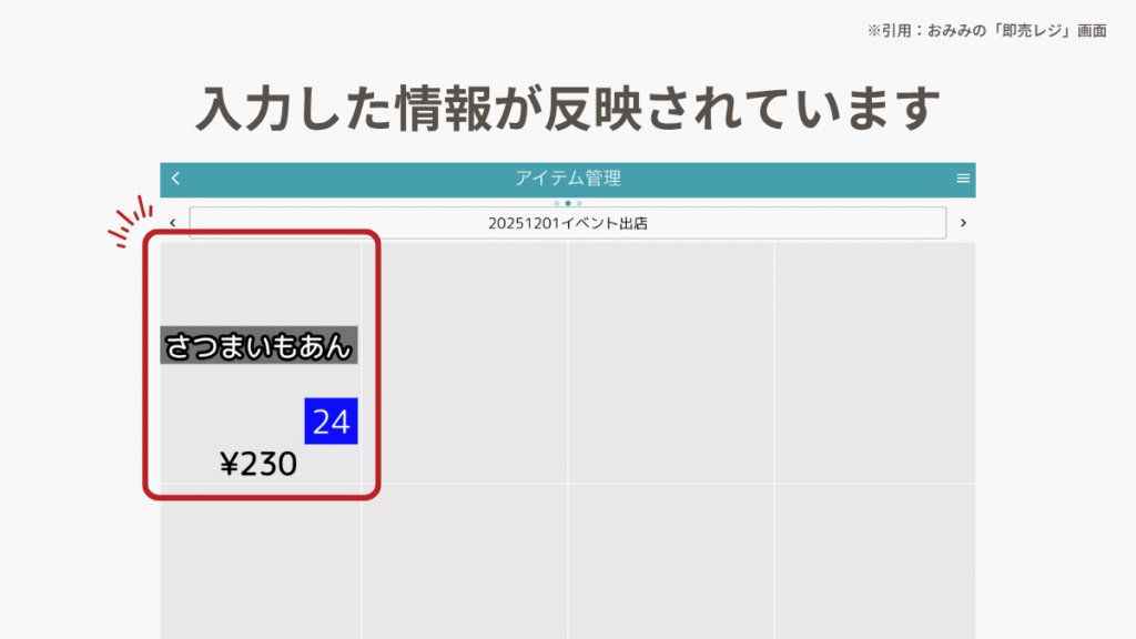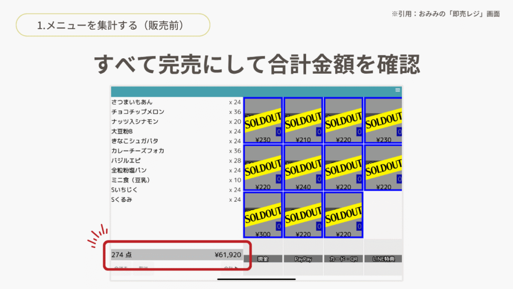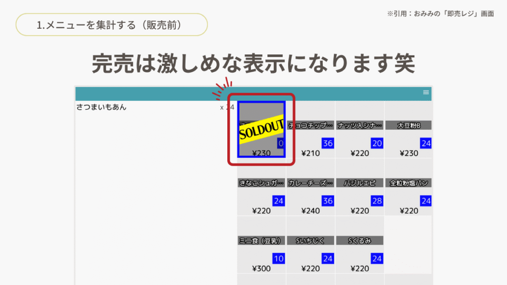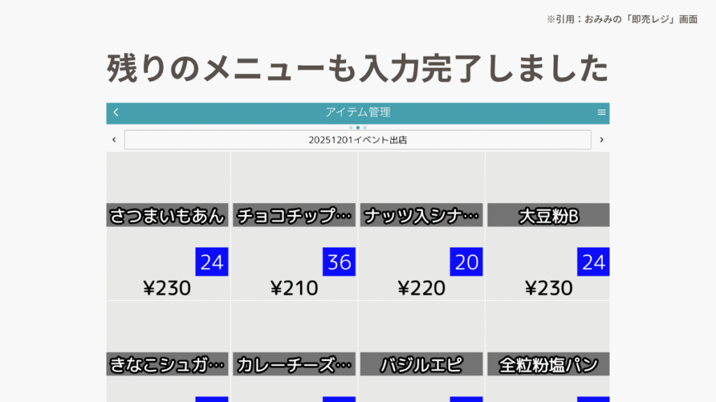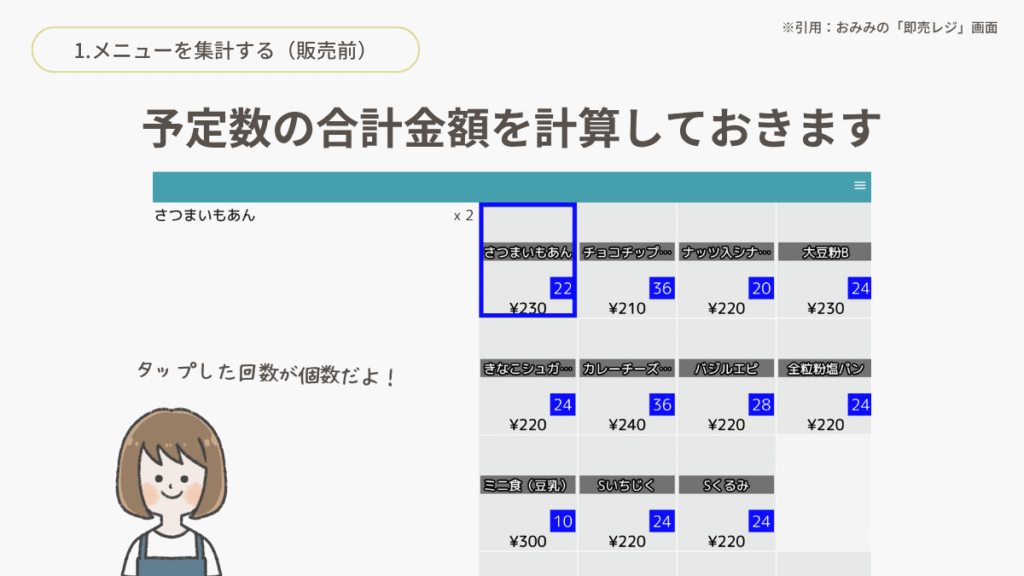 メニューの入力は販売の前日、なんなら当日でもOK。当日、個数が確定してからでも大丈夫です。販売前に販売予定数と合計金額を計算しておきましょう。