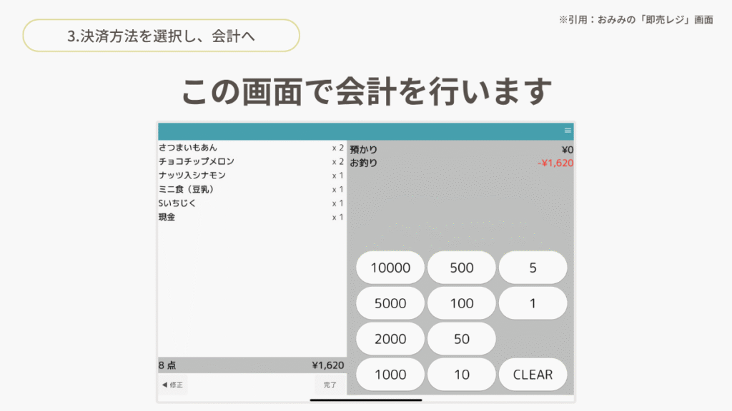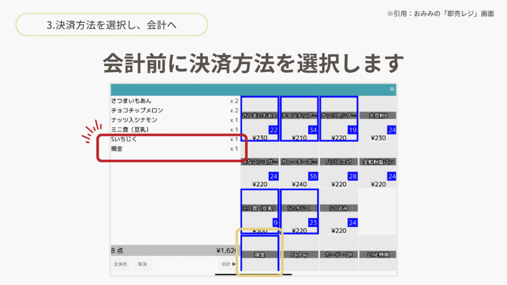 次はレジの流れをまとめつつ、実際に会計をしていってみましょう。