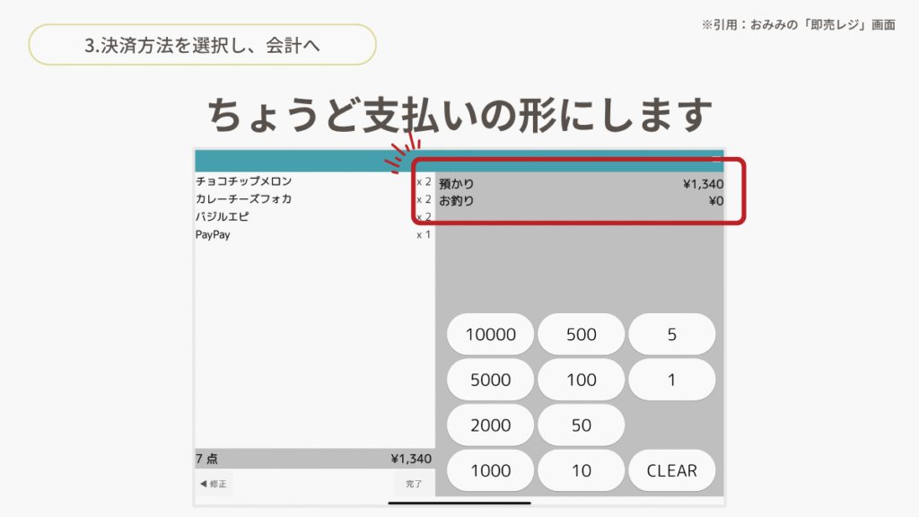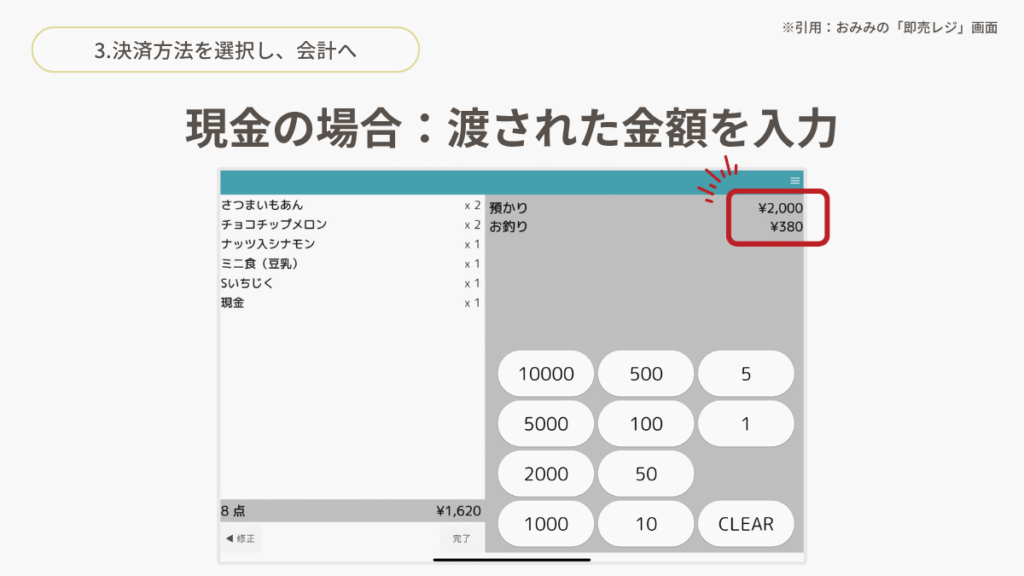 今回は「2000円」預かったとします。「2000」と押すとお釣りが表示されますので、渡しましょう。