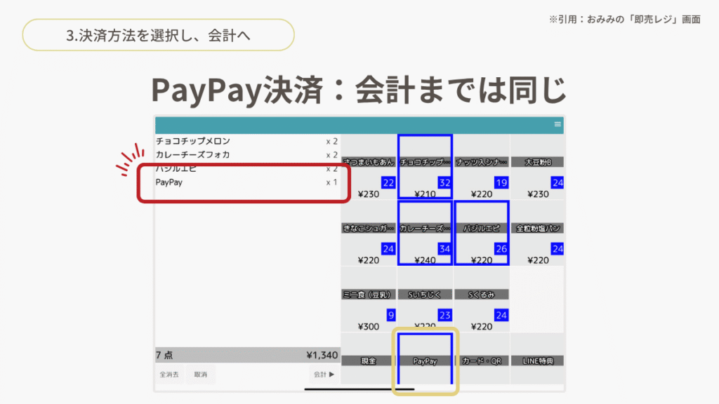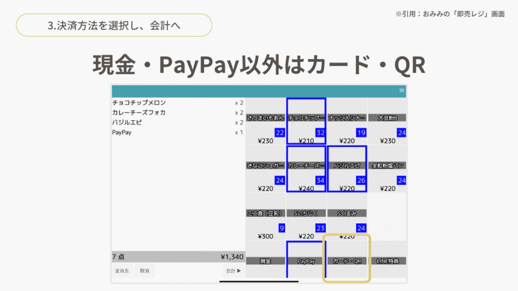 「PayPay」「カード・QR」決済を選んだ場合も同じ。最後に支払方法を選択して、会計に進みます。