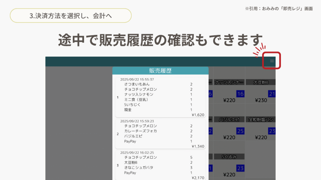 なお右上のマークから販売履歴の確認もできます。現金などの表示もされていますね。