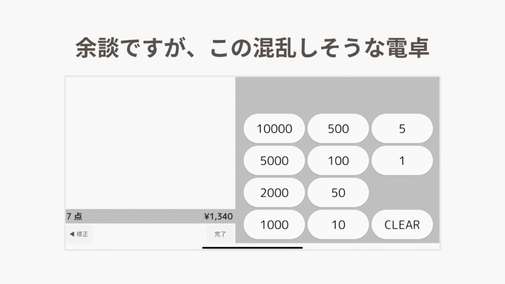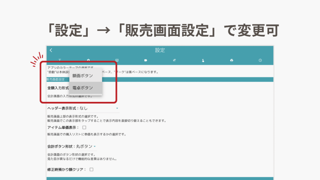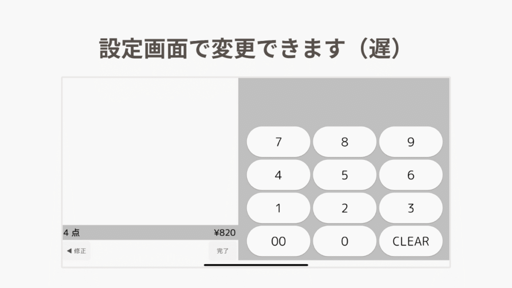 ホーム画面の「設定」から「販売画面設定」の金額入力形式で、額面ボタンか電卓ボタンを選べるのでお好みでどうぞ。慣れたら額面のが楽だけど、電卓の方がちょっきりの金額入力は楽です。