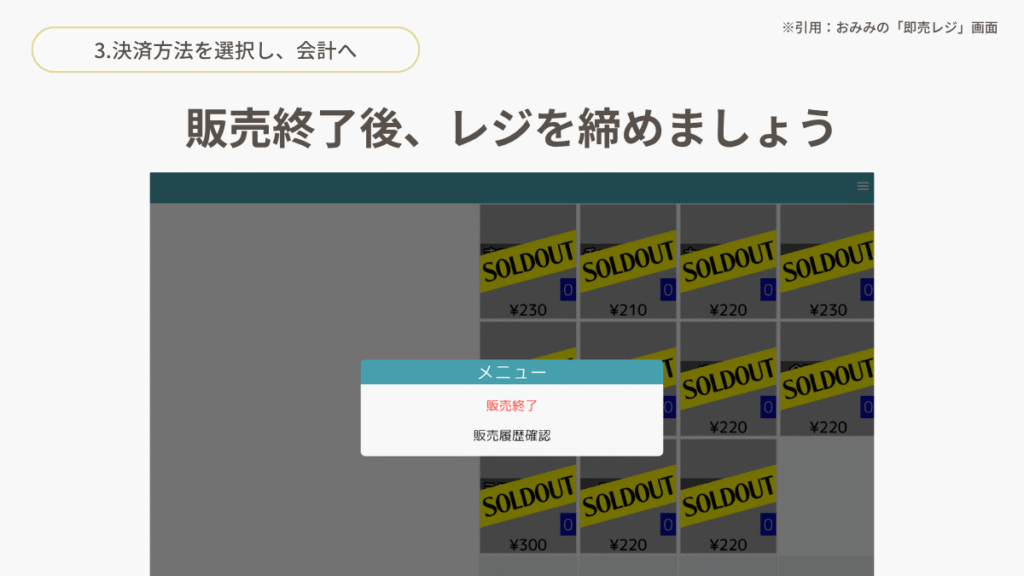 終わったら「完了」を押して、元の画面に戻ります。同じように会計を進めていきましょう。今回はすべて完売したとして集計していきます。
