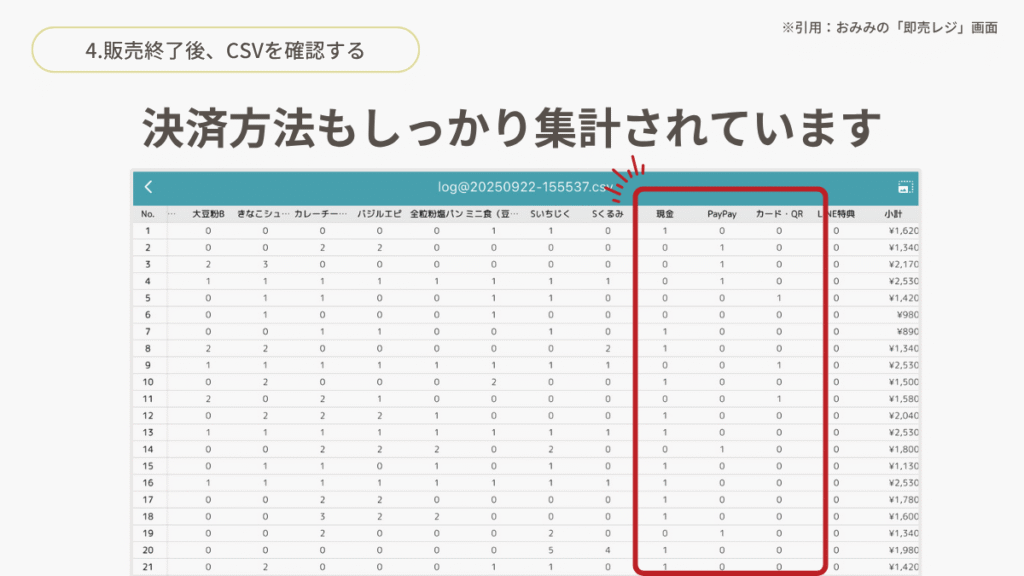 あとはPayPayやクレジットカード決済会社でみれるデータと合わせれば間違いがないことがわかりますよね。
