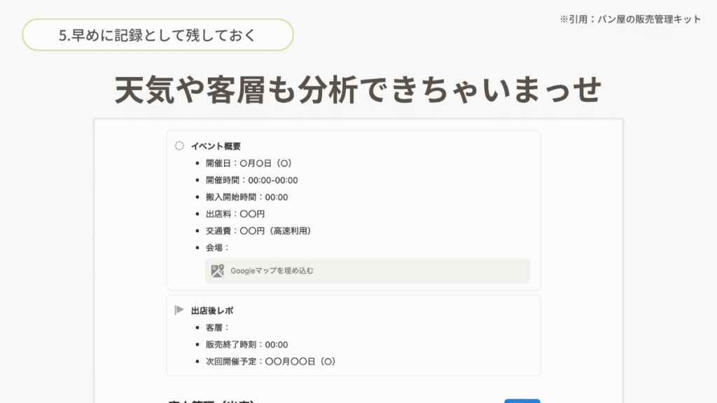 こちらの販売管理キット、こんな感じで出店の記録も残せます。天気とか、気温も残しておくと分析にも使えますよ。